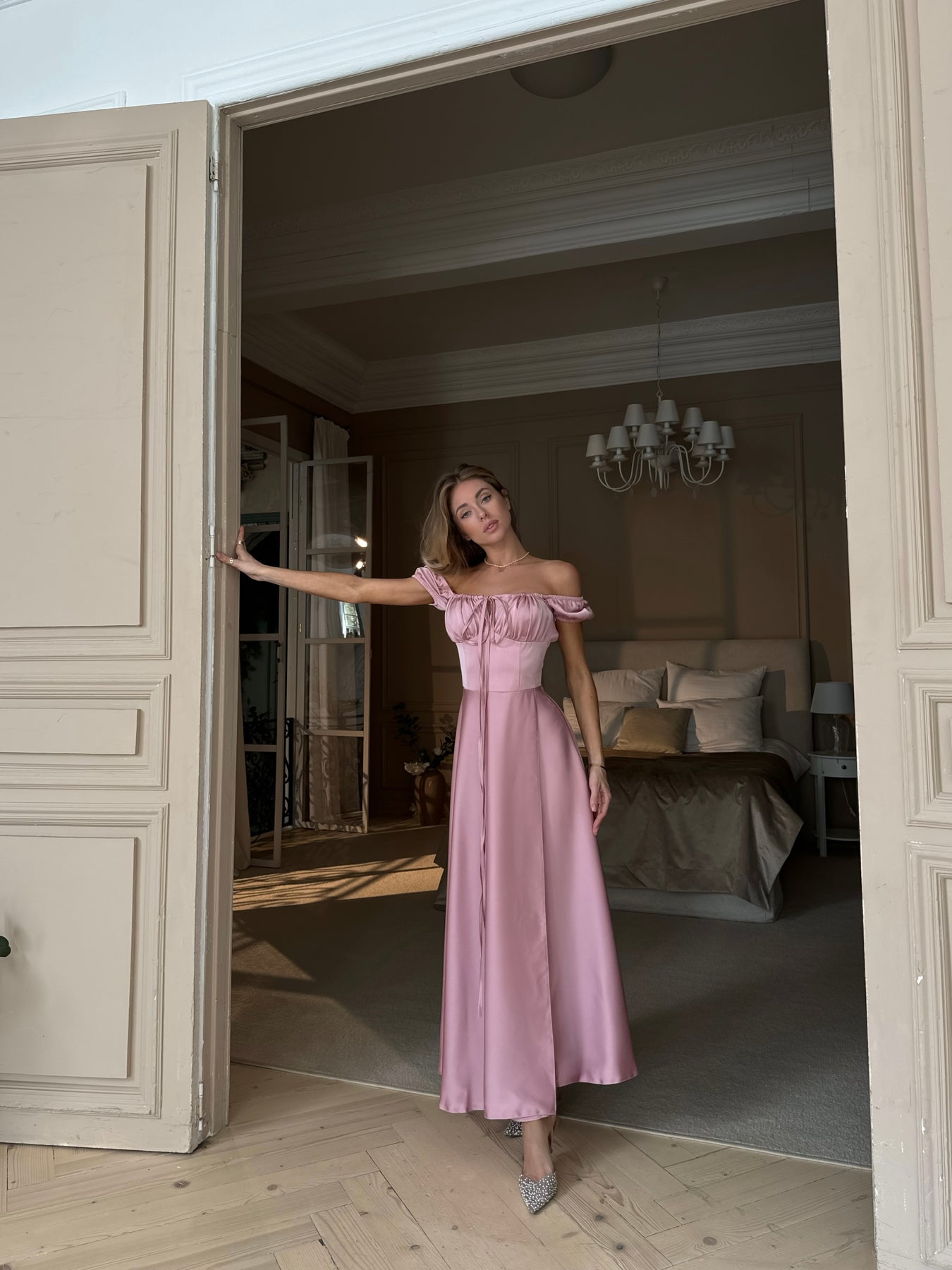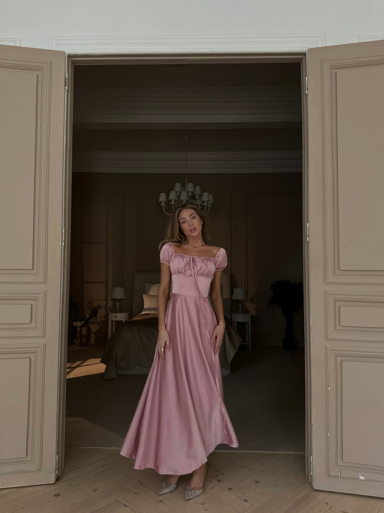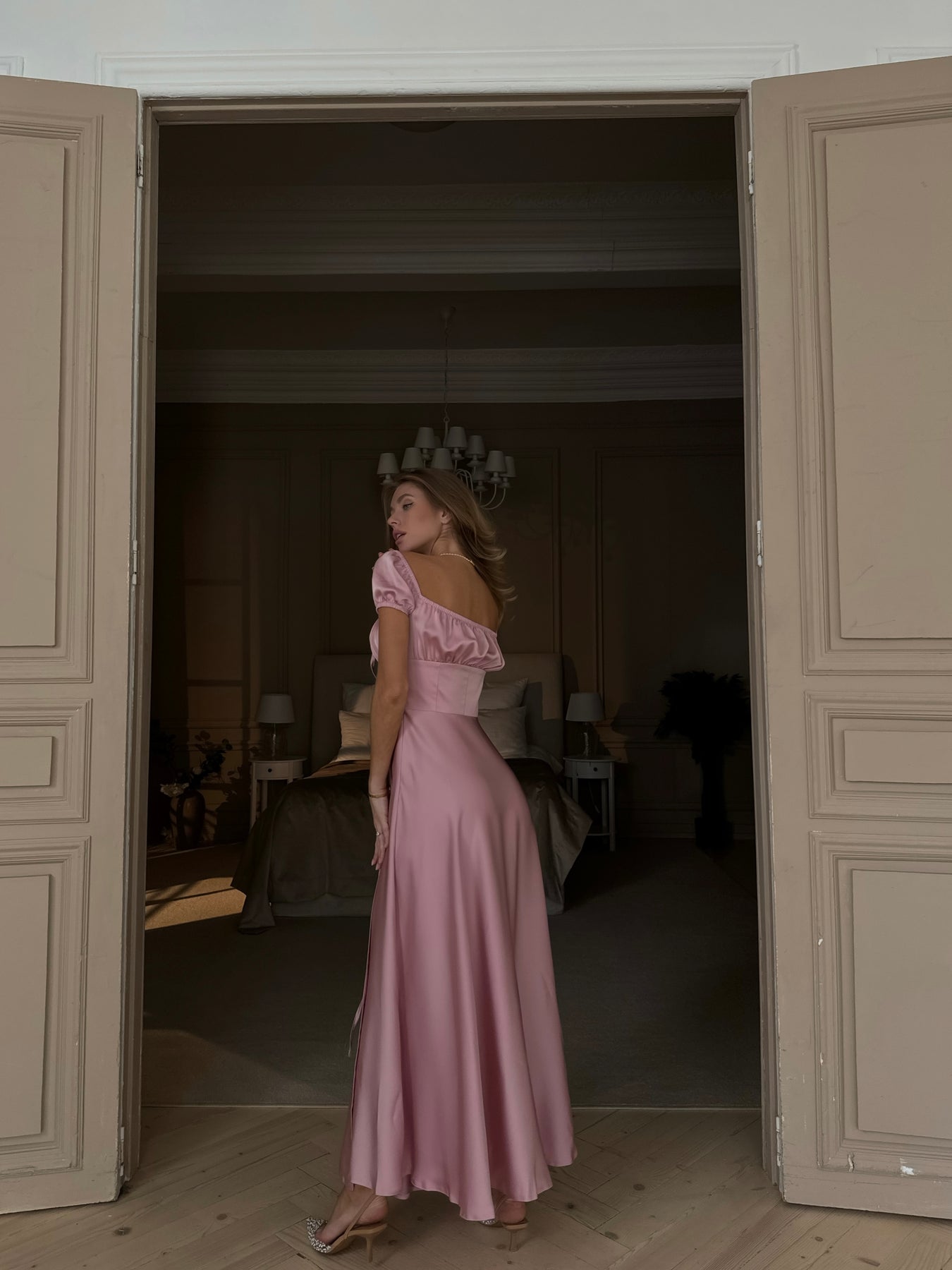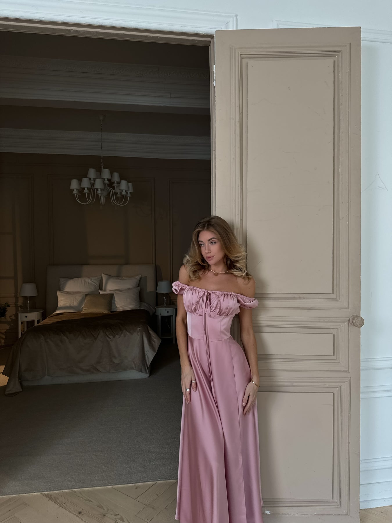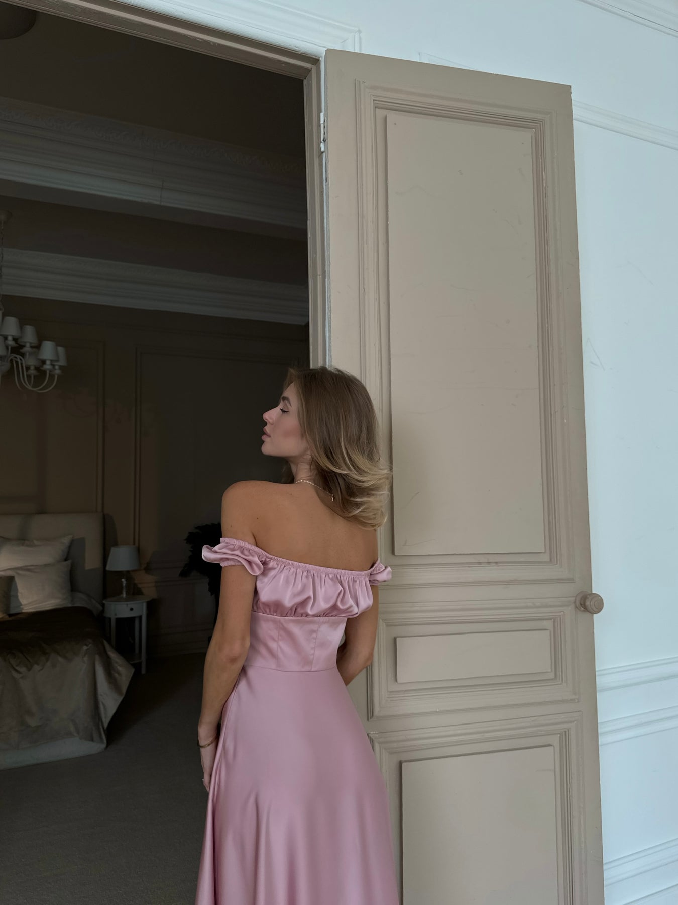 Elevate your style with this stunning maxi satin dress, featuring a romantic sweetheart neckline and versatile short sleeves that can be worn on or off the shoulders. Designed to make a statement, this dress combines elegance with a touch of allure, thanks to its high leg slit.
